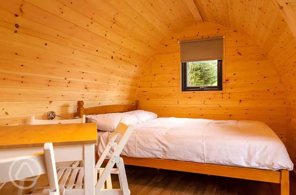 Camping pod with a double bed and a bunk bed, bedding is not provided so please either bring your own or hire bedding from the site. Inside is a wall heater, electric and USB sockets, lighting, a small table and chairs. Shared toilet, shower and washing facilities are nearby. Dog friendly.