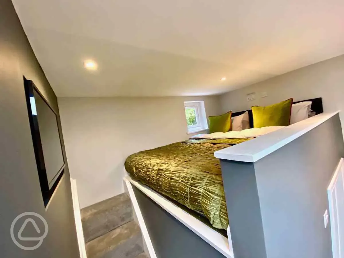 Glamping cabins with 3m lofted ceilings and skylights with a king-sized mattress on a mezzanine level with an HDTV (bedding not provided). Fully equipped kitchen with a gas hob, electric fan oven, fridge, dishwasher, Nespresso coffee machine and a dining table with two chairs. Ensuite with a gas-fired shower, toilet and sink (please bring towels). Open plan living area with a sofa, space for air beds, a 4m 3D projector, surround sound, WiFi Xbox One and Blu-ray player. Optional VR set available. Outside is a private decking with seating, an electric hot tub and Weber gas BBQ. Dogs welcome.