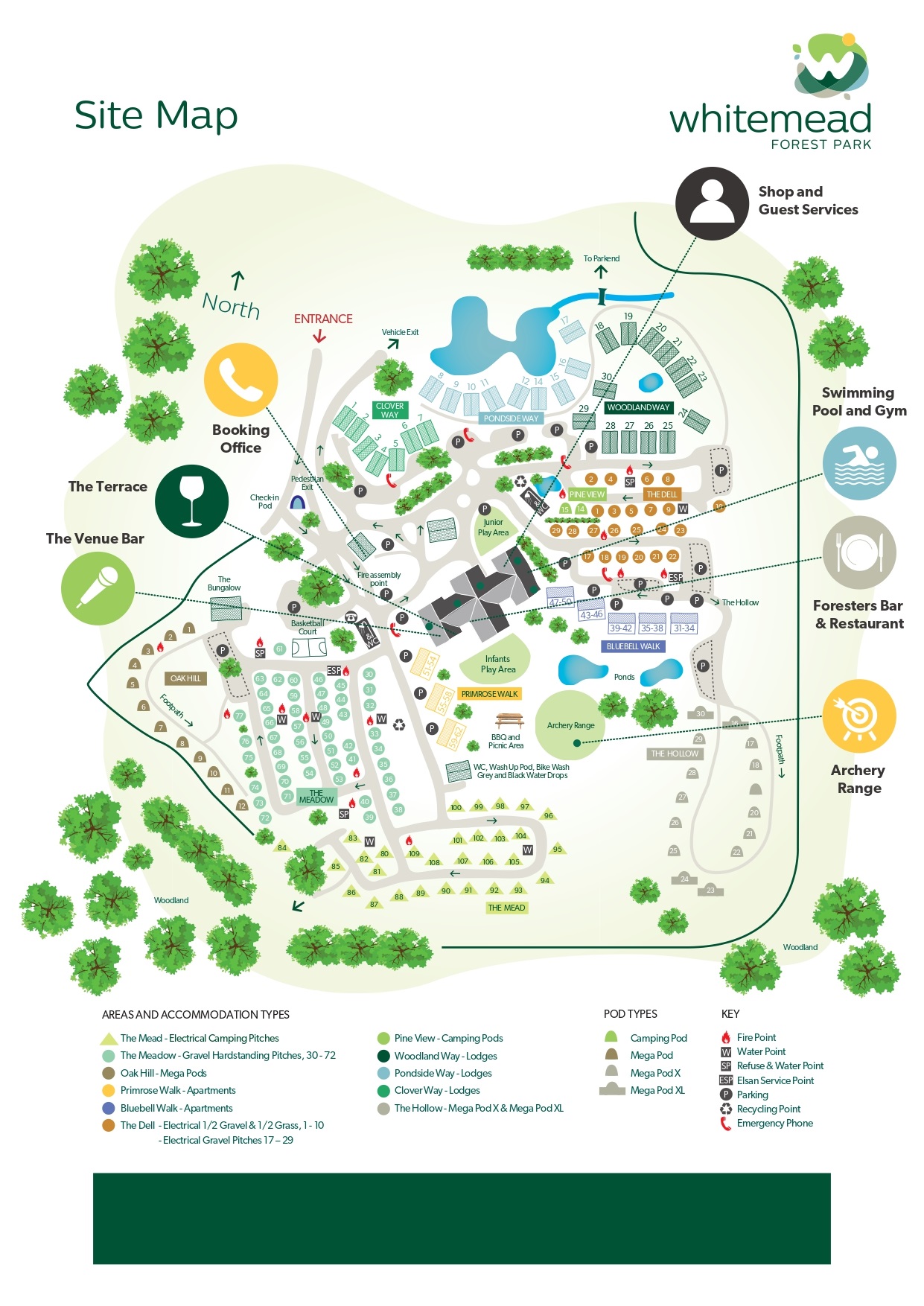What time is check-in and check out for the pods at Whitemead Forest Park?