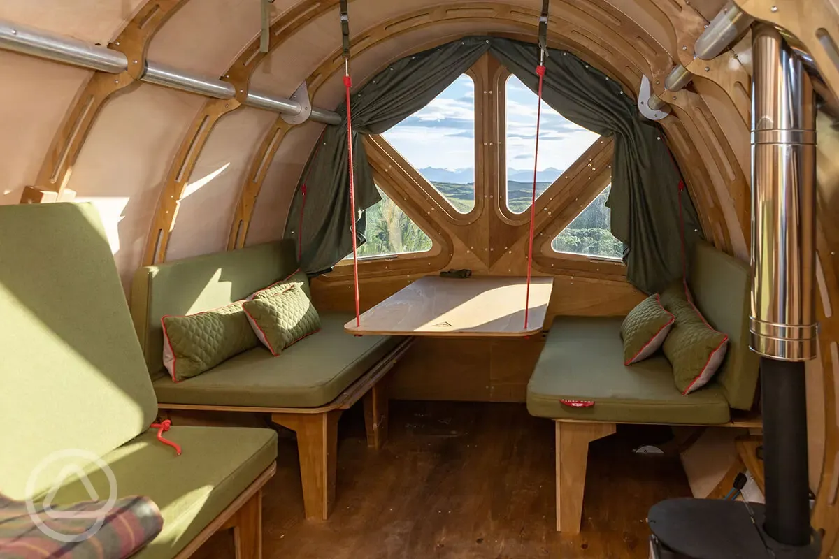 Eco friendly, sustainable glamping pod that is set up for arrival with a table with two bench seats, a separate seating area, mains electricity and a wood burning stove. Instructions included to convert the table into a double bed and the seating area into twin bunk beds with a 60kg limit on the upper bunk. Separate bathroom with a sink, loo and hot shower with complimentary toiletries, heated towel rail and hand drier. Private garden room nearby with seating, fridge, microwave, crockery and cutlery. Bedding and towels provided. Sorry, no dogs.