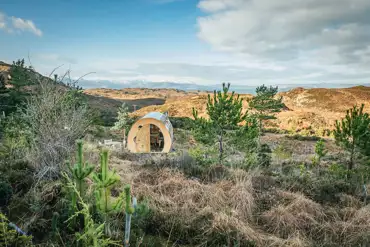 Highland Hangout is set on the west coast of the Highlands, five minutes from the coast and only 45 minutes to the Isle of Skye - great for couples and families wanting to explore the raw beauty this part of Scotland has to offer. The Fuselage pod has a unique design inspired by aerospace and has been built using sustainably sourced wood and recycled aluminium. The pod is well insulated to keep the elements out, plus there is a wood-burning stove to ensure a cosy stay. Upon arrival, you'll find a table with two bench seats plus sofa seating and a window at the end for admiring the surrounding countryside views. There is a guest book with instructions on how to convert the seating into your beds. The table and bench seating turns into a double bed whilst the sofa seating turns into two individual bunk beds for little ones. Do note that the upper bunk has a weight limit of 60kg. Separate from the Fuselage pod is The Cuil na Sith, a private garden room with large, double glazed windows, a small fridge, kettle, air fryer and microwave plus basic cutlery and crockery for basic meals. Enjoy a glass of your favourite tipple as you admire the views towards the Cuillin range or watch your neighbours - the deer and birdlife! You will also have access to your own private bathroom located in the shared facilities block. Your bathroom will have a loo, a wash basin, a hot shower, a heated towel rail and a hot air hand dryer. You will also be provided with complimentary organic Highland Soap Co. products including body wash and shampoo. Towels and bed liners are provided for each guest along with a single duvet and pillow, please specify your preference for goose down or eco friendly micro fibre pillow filling when booking. You will just need to bring provisions. There is also a tree tent onsite, set in the treetops, in a separate area of the site.
