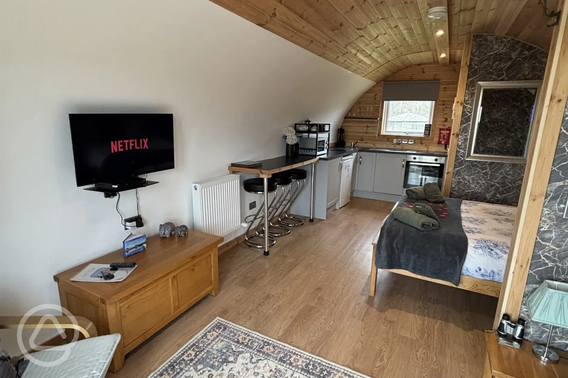 Pod with a king sized bed and all bed linen, bedding and towels included. There is an ensuite toilet and shower with a hair dryer and basic toiletries. There is also a fully equipped kitchen with a hob, oven, fridge, freezer, microwave, kettle, toaster and coffee machine. Cooking utensils, cutlery and crockery are supplied. Tea and coffee as well as cooking and household basics are included. There is also a cosy living and dining area. There is heating, a TV and electric sockets. Outside there is a seating and dining area, a fire pit, BBQ and hot tub. Dogs are welcome.